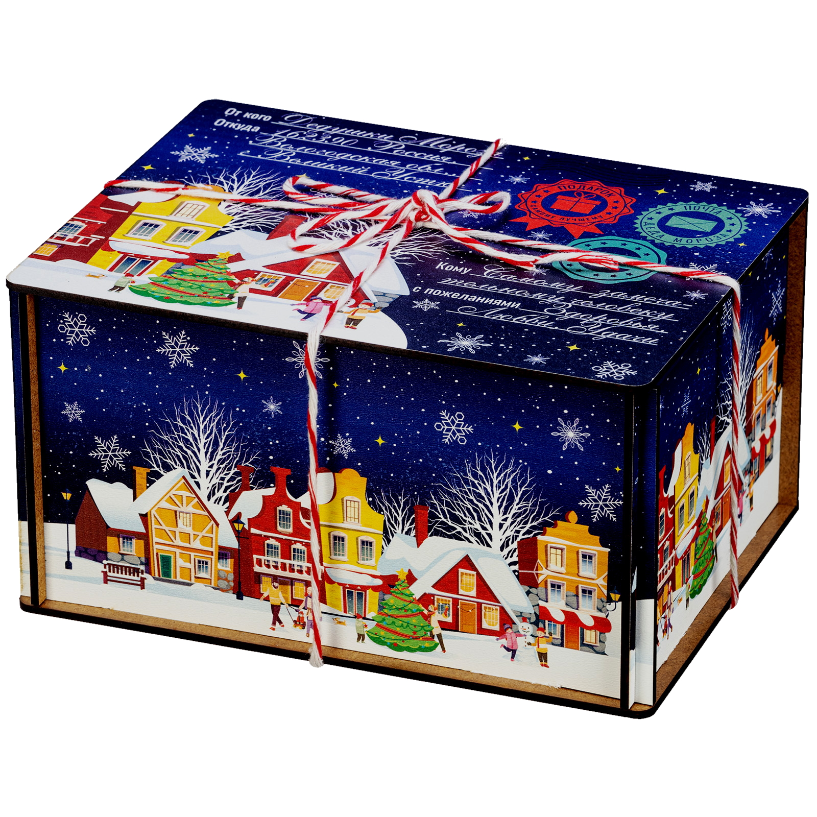 “Сияние ночи” - это новогодний сладкий подарок, который идеально в себе сочетает неповторимый вкус любимых сладостей и креативную оригинальную упаковку. Сладости бережно спрятаны в небольшой деревянный ящичек, украшенный со всех сторон разнообразными праздничными иллюстрациями в виде небольшого зимнего городка. Сверху упаковка закрыта удобной крышкой, оформленной в стиле посылки - посмотрите, даже фирменные печати есть! Внутри этого подарка находится килограмм разнообразных отборных сладостей и небольшой памятный сувенир. Такой подарочный набор универсален - его с легкостью можно вручить как взрослому, так и ребенку - восторг гарантирован в любом случае!