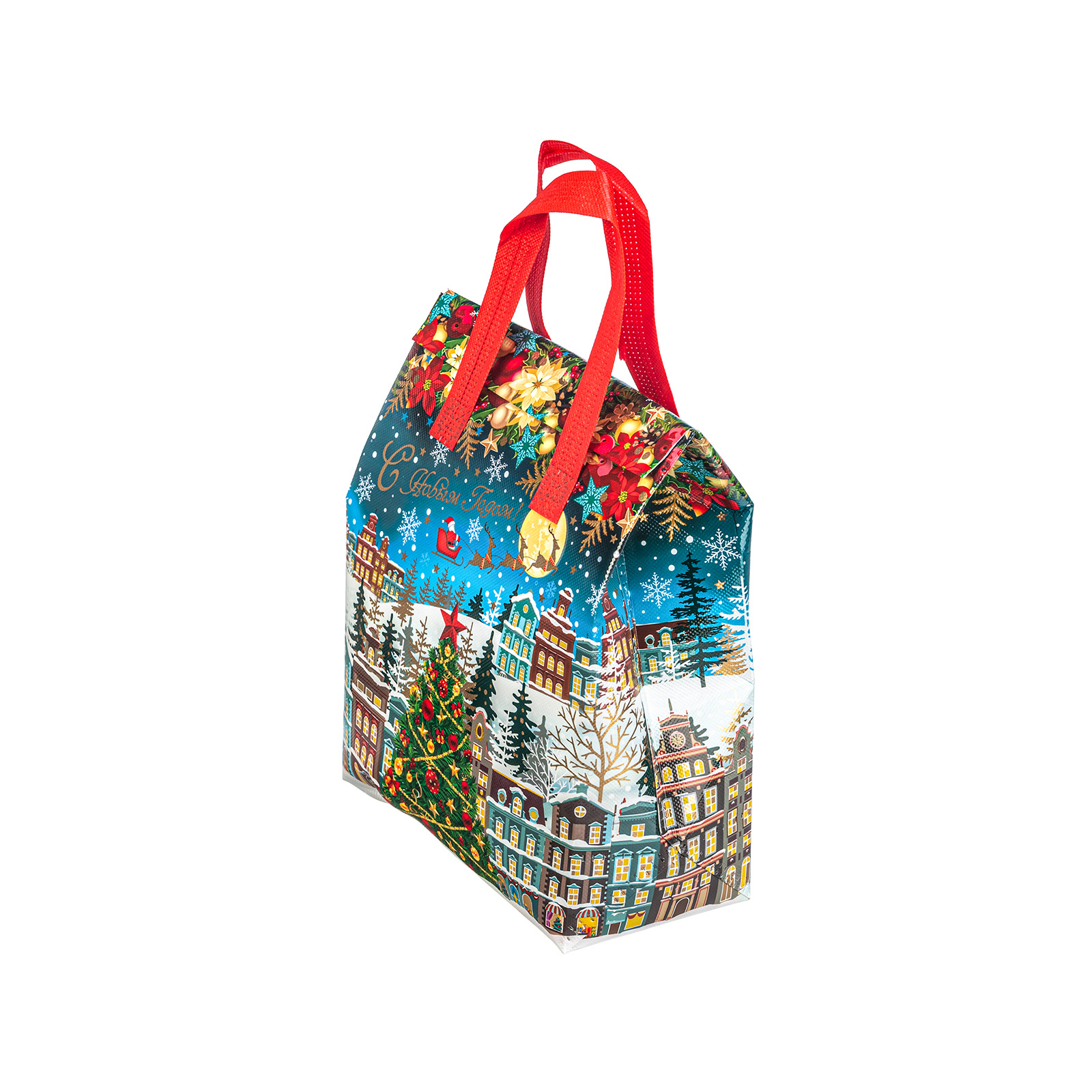 Интересный вариант новогоднего подарка – «Сумочка Чудо-городок». Отлично подойдет на подарок в 2026 году с символом Лошадь. Внутри такого презента находится кондитерский набор весом 1000 граммов.