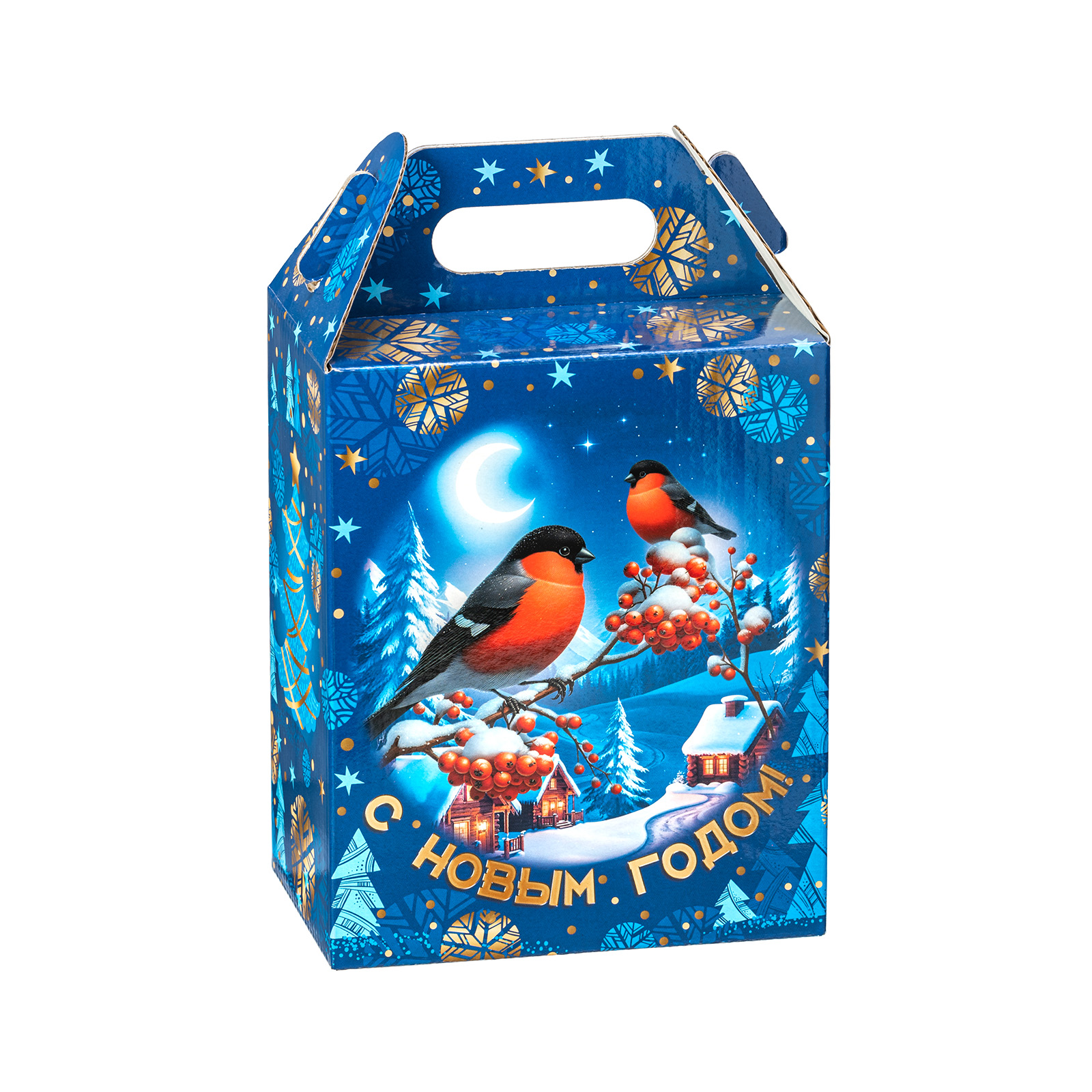 Интересный вариант новогоднего подарка – «Вестники зимы». Он представлен в разделе Картон. Отлично подойдет на подарок в 2026 году с символом Лошадь. Внутри такого презента находится кондитерский набор весом 1000 граммов.